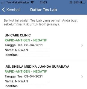 - Pada menu “Daftar Lab” dapat dilihat semua daftar tes yang pernah kamu lakukan lengkap dengan hasilnya. Pilih hasil tes untuk memunculkan kode QR yang nantinya akan di scan oleh petugas bandara sebagai syarat masuk ke Bali ataupun wilayah lainnya.